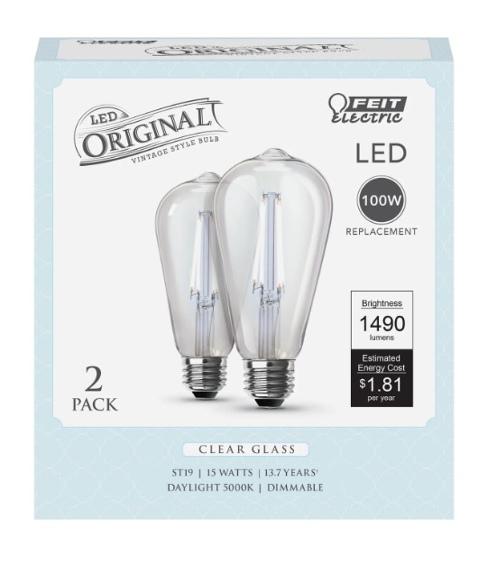 Combine the classic look and feel of glass filament lighting with the advantages of modern LED technology with a two-pack of ST19100CL/950CA/2 LED light bulbs from Feit Electric. These dimmable elegant ST19 dimmable bulbs produce 1490 lumens of 5000K Daylight color temperature light using only 15 watts - up to 85% less than an equivalent 100-watt incandescent. Enhance 90+ CRI makes skin tones more natural and colors vibrant, all while saving energy and lasting 15,000 hours or more. A stylish tapered look with exposed filament wrapped in glass housing is ideal for decorative lighting fixtures and will enhance the décor of any room.