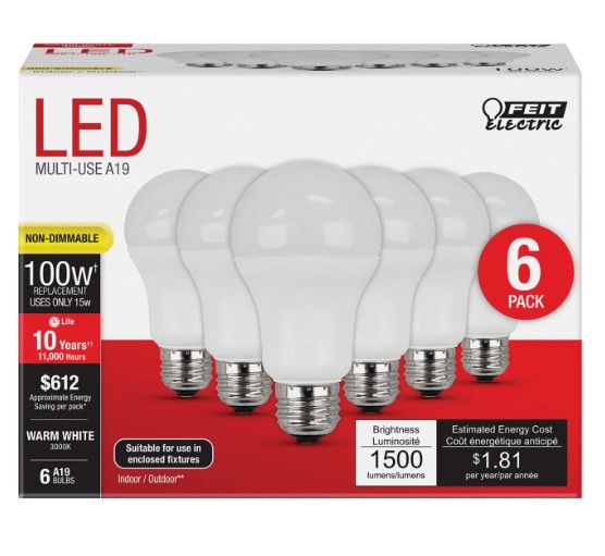 Enjoy all the benefits of advanced LED energy-saving technology with the Feit Electric A1600/830/10KLED/6 LED light bulb. This general purpose A19 bulb products 1500 lumens of 3000K Warm White light using just 15 watts - up to 85% less than an equivalent 100-watt incandescent. Each LED bulb has an average rated life of 11,000 / hours/10 years, is RoHS compliant, and are 100% mercury free. Choose a dependable decorative bulb to brighten your home.