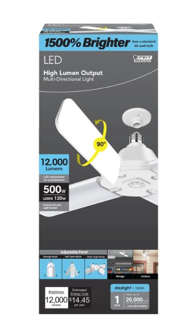 The Feit Electric Adjustable panel light provides an efficient way to get more light in less space. It has 4 adjustable panels that fold down 90° to direct light exactly where needed. This ultrabright light is ideal for larger spaces or higher ceilings. Use it in garages, workshops, porches, and industrial spaces to get the most light from a small bulb. Integrated LEDs produce 12000 lumens using only 120 watts. This powerful bulb uses 76% less energy than 500-watt incandescent. 5000K Daylight color temperature light provides a crisp light ideal for working on tasks and seeing fine details. The ADJ12000/5K/LED is 15X brighter light than 60-watt incandescent bulbs. It lasts up to 20,000 hours, delivering reliable light for up to 18.3 years with average use.