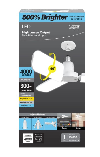 For garages, attics, patios, or other dark spaces, the Feit Electric ADJ4000/3CCT/LED Multi-Directional light provides an efficient and flexible way to get bright illumination in a small form. This light screws into standard E26 sockets and comes with independently adjustable rotating panels that fold down up to 90° to direct light exactly where desired. Integrated non-dimmable LEDs produce 4000 lumens of 3000K/4000K/5000K Bright White, Cool White, or Daylight White light using only 35 watts – an energy savings of over 88% compared to equivalent 300-watt incandescent bulbs. Each light lasts up to 25,000 hours/22.8 years of bright, reliable illumination. The estimated annual energy cost is only $4.22, based on 3 hours of daily use.