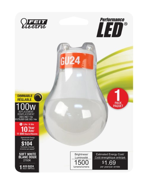 Enjoy all the benefits of advanced LED energy-saving technology with the Feit Electric A100DM827GU24/10KLED Performance LED light bulb. This dimmable 2700K Soft White light with a GU24 base puts out 1500 lumens of brightness while using only 14 watts - up to 86% less energy than an equivalent 100 watt incandescent light bulb. Our performance A19 bulbs have an average life of 11,000 hours/10 years, are RoHS compliant and are 100% mercury free. Choose a dependable high-lumen bulb for residential or commercial applications.