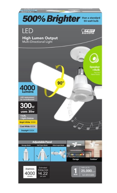 For garages, attics, patios, or other dark spaces, the Feit Electric BTADJ40003CCTLED Multi-Directional Light with Speaker provides an efficient and flexible way to get bright illumination in a small form. Play music, podcasts, and more with the connected Bluetooth speakers. No hub is necessary. The light screws into standard E26 sockets and comes with independently adjustable rotating panels that fold down up to 90° to direct light exactly where desired. Integrated non-dimmable LEDs produce 4000 Lumens of 3000K/4000K/5000K Bright White, Cool White, or Daylight White light using only 35 watts – an energy savings of up to 88.3% compared to equivalent 300-watt incandescent bulbs. Each light lasts up to 25,000 hours/22.8 years of bright, reliable illumination. The estimated annual energy cost is only $4.22, based on 3 hours of daily use.