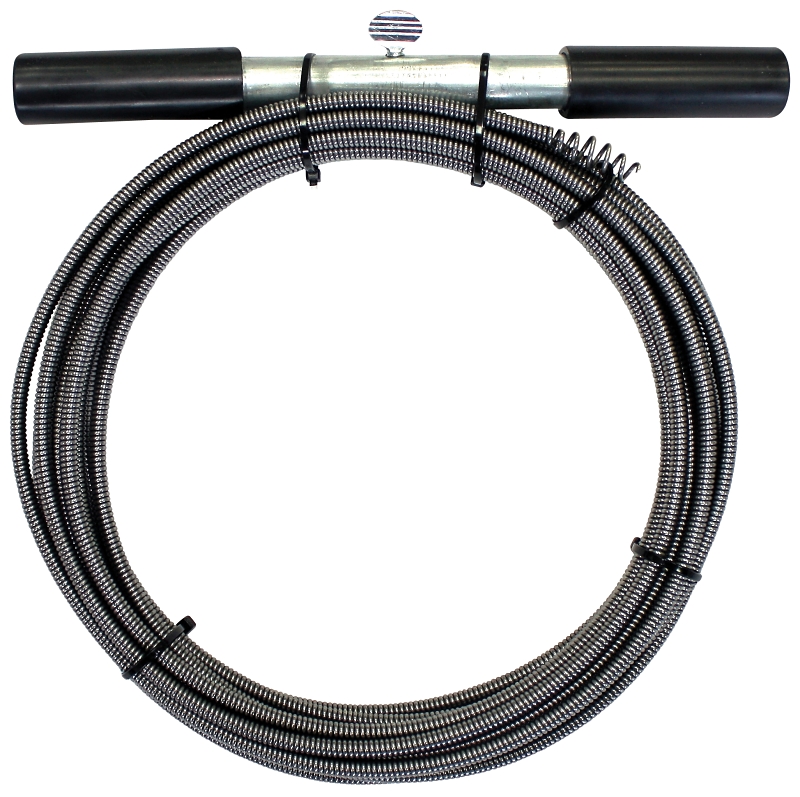 This drain augur is for small household drains. It's made of high carbon, oil tempered, non-kink, flat 1/4 in steel wire and has a closed wound spring boring head. The drum has a steel rod frame holder for easy storage and use.
