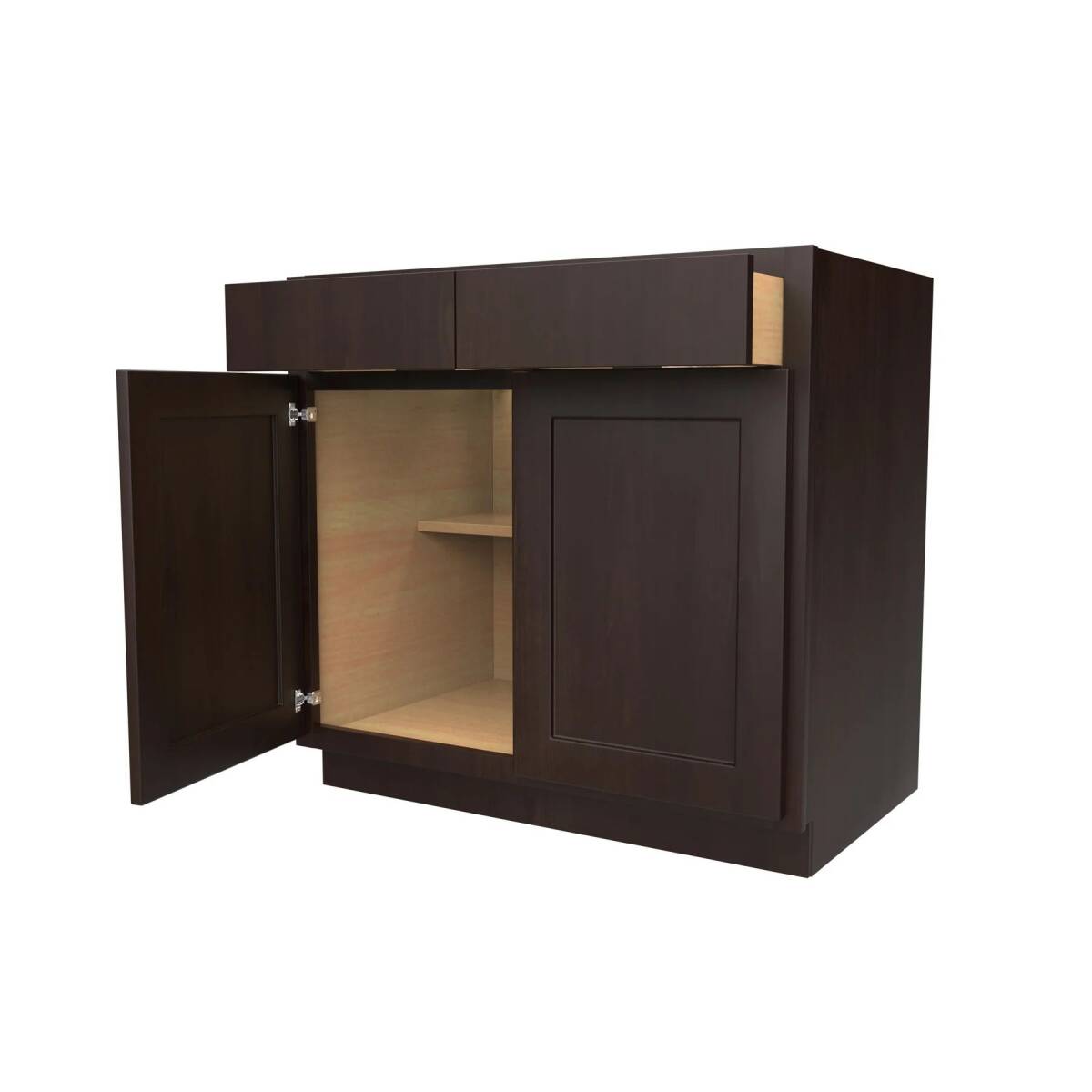 Doors: A ½-in reveal 2½-in wide shaker style solid wood Birch with a flat center panel, Mortise and Tenon construction, slab drawer front.
