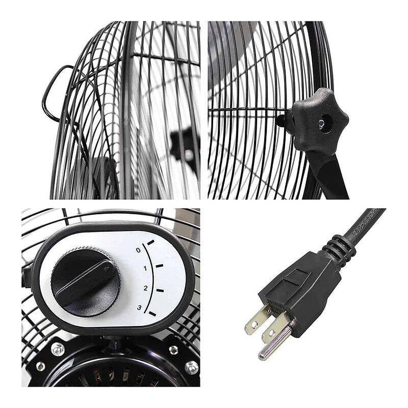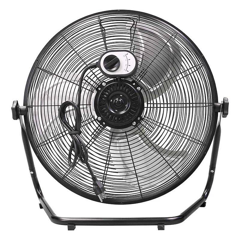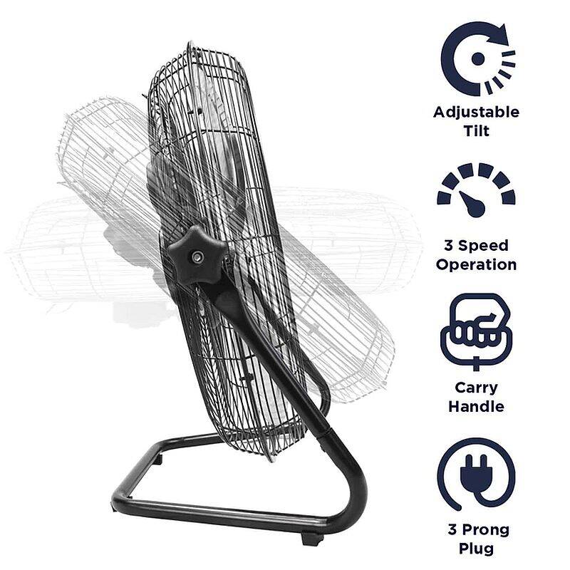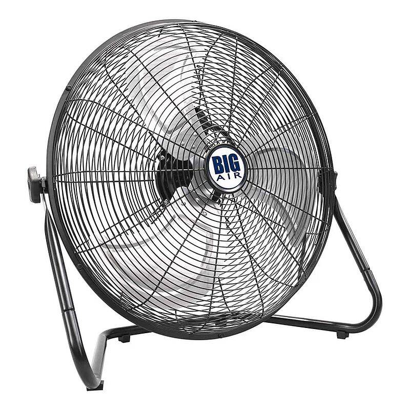 The Big Air 20-inch High Velocity Floor Fan is perfect for keeping cool while relaxing indoors in your home, working in the garage or basement, or even to spot cool employees in a warehouse or commercial space. This powerful air circulator requires minimal assembly and has individually balanced metal fan blades and non-skid feet for minimum vibration and a quieter operation, as well as a powder-coated black finish for ease in cleaning. Take this portable fan wherever you go with a built-in carry handle and keep the refreshing breeze going using your choice of 3 speed selections and a fully adjustable, tilting fan head.