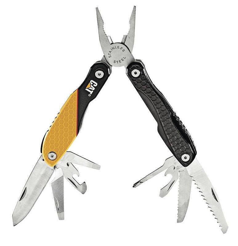 TOOLS INCLUDE: Long Nose Pliers, Wire Cutter, Gripper Bottle Opener, Locking Serrated Knife Blade,Large/Medium/Small Slotted Screwdriver, Locking Large Knife Blade, Sngle Cut File, Double Cut File, Can Opener, Locking Saw Blade, Liner Lock - Serrated Knife Blade, Large Knife Blade, and Saw Blade.