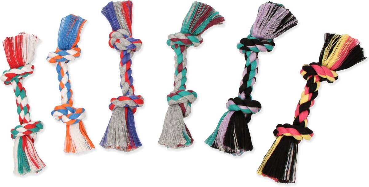 This bone shape dog toy is perfect for interactive pet and owner play, from tugging and pulling to tossing and retrieving. Bright and colorful, the dog bone tug features tight, sturdy knots at each end, making it a good toy for dogs to catch, hold and carry easily.