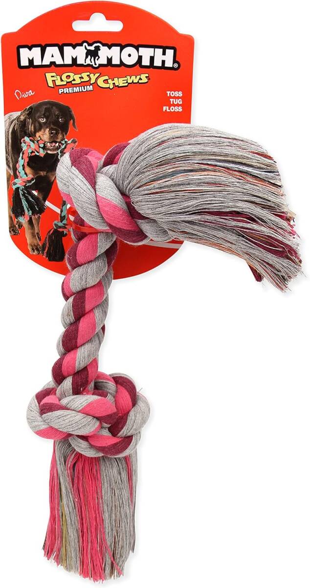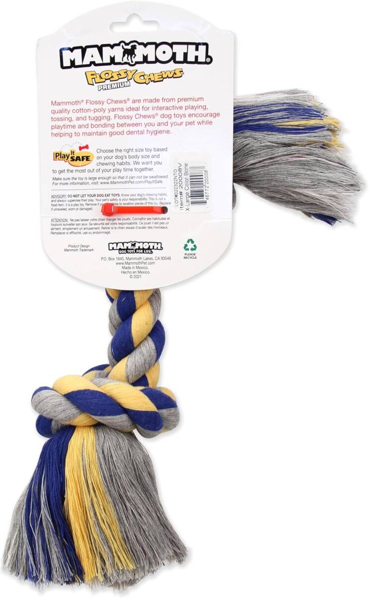 Mammoth Extra-Large 16-Inch rope toy for dogs. Perfect for independent play, tug of war or tossing and playing fetch! Made from cotton blend fibers that naturally floss your pets teeth while they chew and play, supporting good oral hygiene. Perfect for medium dogs weighing over 80 pounds.