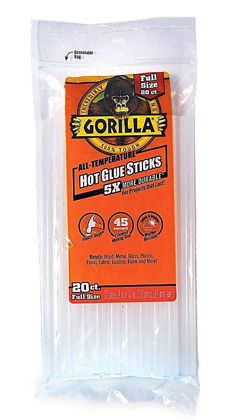 Incredibly tough & versatile, Gorilla Hot Glue Sticks provide a long term hold even on hard to bond surfaces. The clear adhesive works with both high and low temperature glue guns and features an extended working time for added convenience for all types of projects.
