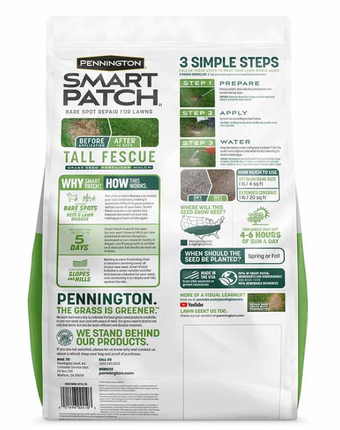 With Pennington Smart Patch, you don't need to know why your lawn has thin, bare or brown spots. Smart Patch eliminates the guesswork and frustration of lawn repairs. This product has everything you need to fix bare spots, neutralize soil and disease problems, and grow thick, lush, water-conserving grass - even on slopes and hills. Pet damage and urine spots? No problem. Lawn disease and poor soil conditions? That's covered, too. With Smart Patch, you'll see quick results you can rely on. It's the smart choice for lawn repairs.