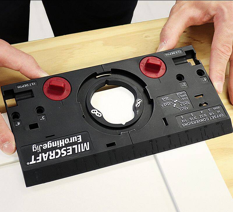The Milescraft EuroHingeJig™ takes the guesswork out of installing European-style concealed hinges. The self-aligning jig works with frameless and face frame cabinets and has settings for all of the most popular hinge styles and cup locations. It even has a feature to help position and mount your door to the cabinet.