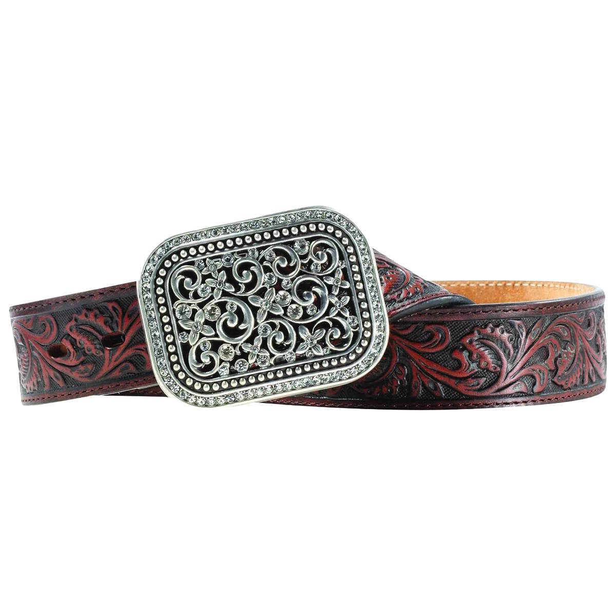 Featuring feminine, floral-embossed detailing, this genuine leather belt is finished with a crystal rectangle buckle for just the right touch of shimmer.