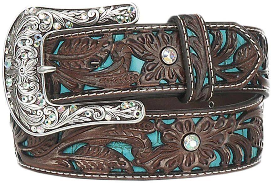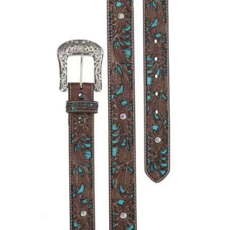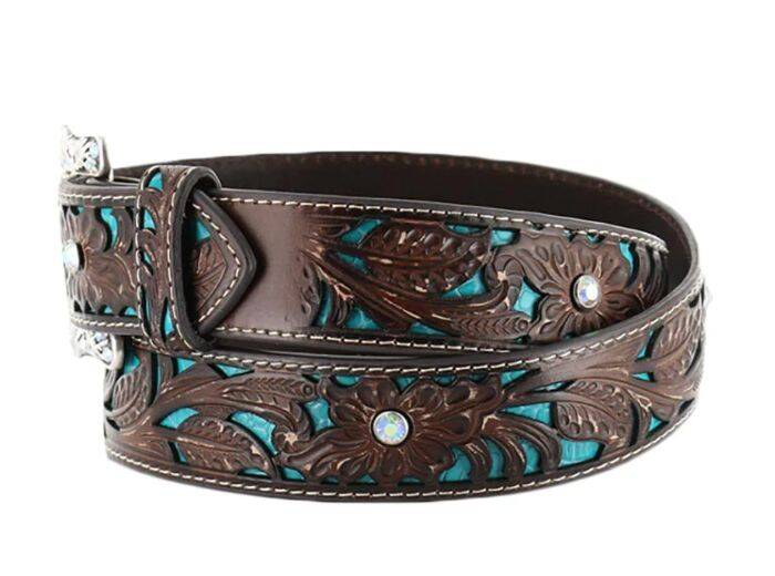 Floral tooled dark-brown leather belt with rhinestone inlet design, turquoise inlay, and a silver buckle