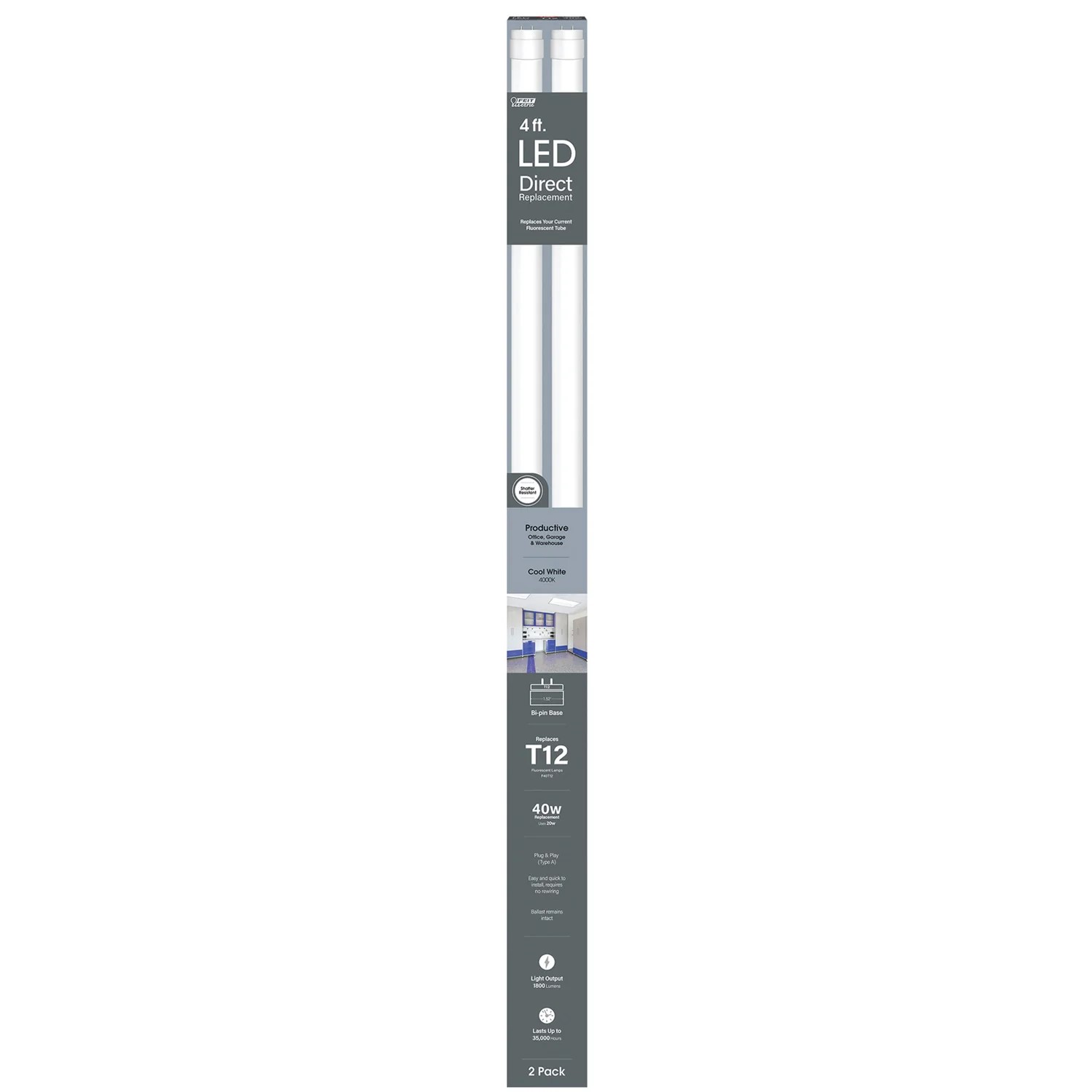 Convert your existing fluorescent fixture to LED technology with the Feit Electric T1248/840/LEDG2/2 LED Lamps. These 4100K Cool White lamps produce 1800 lumens using only 20 watts of electricity - up to 50% less energy than a standard fluorescent lamp. Feit Electric shatterproof fluorescent T12 lamps have an average life of 35,000 hours/32 years are RoHS compliant and are 100% mercury free. Installation is easy: No replacement of the ballast or installation of LED driver or removal of old ballast required. Choose a dependable flicker-free bulb for residential or commercial applications.