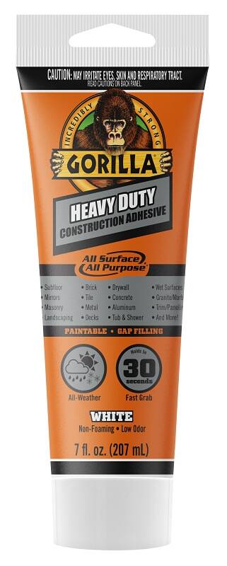 Gorilla Heavy Duty Construction Adhesive is a tough, versatile, all-weather adhesive. The 100% adhesive formula provides a long-lasting, heavy duty bond. We call it All Surface, All Purpose.