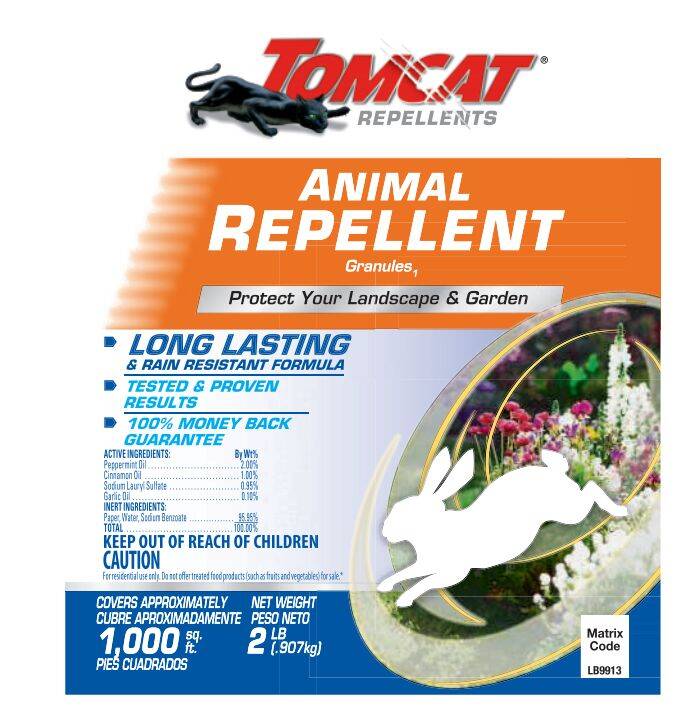 It's the moment every gardener dreads - you walk out to enjoy your beautiful garden and are met by plants that have been so chewed up that they are unrecognizable. Tomcat Repellents Animal Repellent Granules protects your landscape and garden from this greenery assault. The smell and taste of Tomcat Repellents Animal Repellent Granules is unpleasant to rabbits, squirrels, groundhogs, and other small animals. Its long-lasting, rain-resistant formula is safe to use on edible fruits and vegetables as well as around people and pets when used as directed.