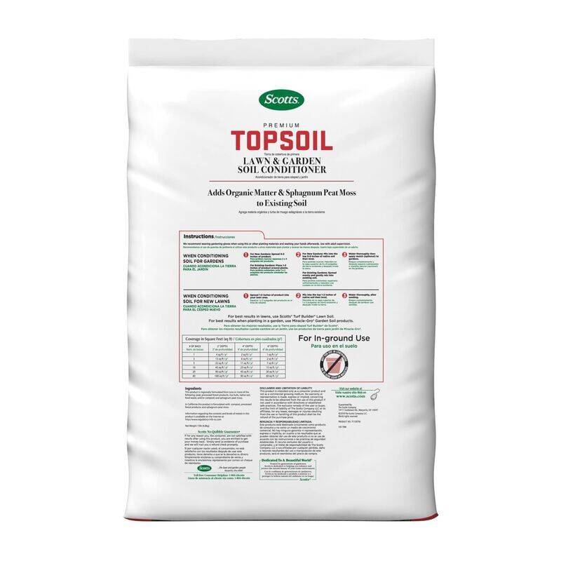 Scotts® Premium Topsoil contains sphagnum peat moss and organic matter to condition the soil in your lawn or garden. Use it as a top dressing to maintain your garden or as a conditioner when establishing a new garden. For in-ground use only.