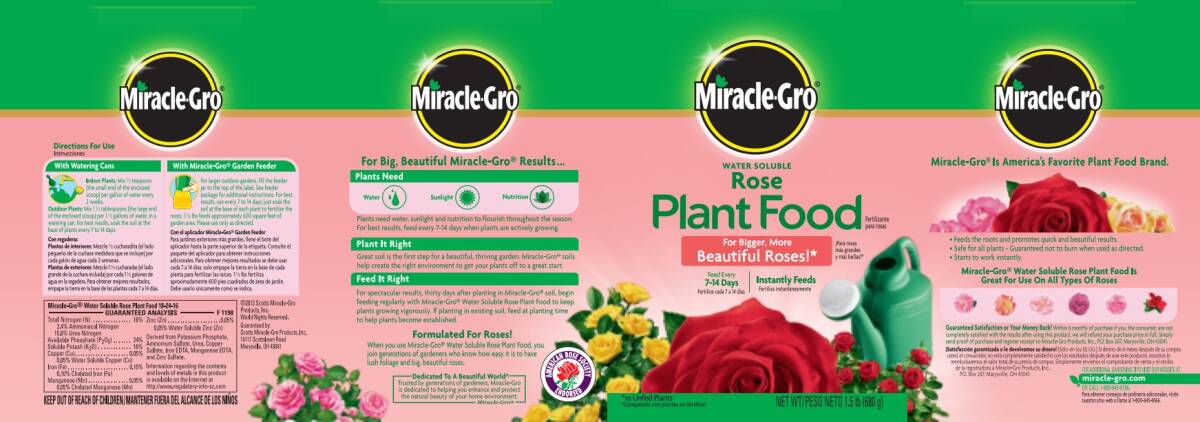 Grow bigger, more beautiful roses (vs. unfed plants) with the help of Miracle-Gro® Water Soluble Rose Plant Food. This rose fertilizer gets to work instantly to promote quick and beautiful results. It is great for use on all types of roses. Miracle-Gro® Water Soluble Rose Plant Food can easily be applied with a watering can or Miracle-Gro® Garden Feeder™. The use of a watering can is perfect for both outdoor and indoor plants. For indoor plants, mix ½ teaspoon per gallon of water every 2 weeks. For outdoor plants, mix 1 ½ tablespoons per 1 ½ gallons of water. The use of a Miracle-Gro® Garden Feeder™ is perfect for larger outdoor gardens. Simply fill the feeder jar to the top of the label (see feeder package for additional instructions) and soak the soil at the base of each plant to fertilize the roots. For best results, feed every 7 to 14 days. 1.5 lbs. of Miracle-Gro® Water Soluble Rose Plant Food feeds approximately 600 sq. ft. of garden area.