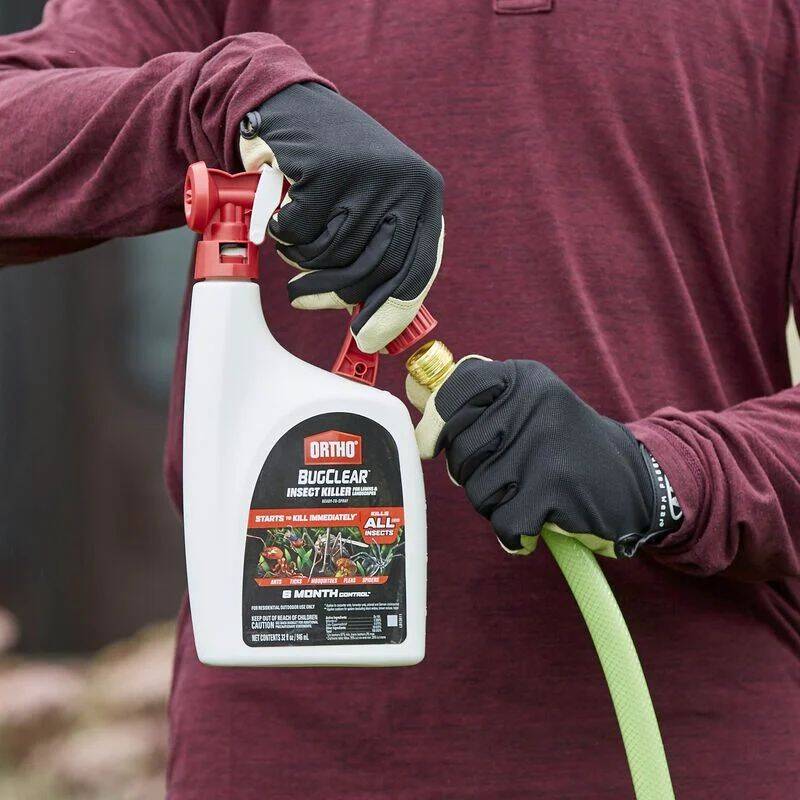 Kill outdoor insects with Ortho® BugClear™ Insect Killer for Lawns & Landscapes Ready-to-Spray bottle. This pest control product kills 235 listed bugs, including ants, ticks, mosquitoes, fleas, spiders, hornets, scorpions, beetles, periodical cicadas, and other listed insects (see product label for full list). Non-staining and odor free, Ortho® BugClear™ Insect Killer for Lawns & Landscapes Ready-to-Spray starts killing within minutes and provides long-lasting control in your yard. Use this product on lawns, the home perimeter, porches, patios, stored lumber, ornamentals, flowers, trees, shrubs, and listed vegetables and fruit trees. Apply when bugs first start to appear; wait 4-6 weeks between applications. It's easy to protect your backyard from bugs-just attach your hose to the sprayer and follow label directions for your lawn, plants, or home perimeter as applicable. One 32-oz. bottle of Ortho® BugClear™ Insect Killer provides treatment for a 5,300 sq. ft. lawn, 1,400 sq. ft. of foundation or perimeter, or across 2,700 sq. ft. of foliage.