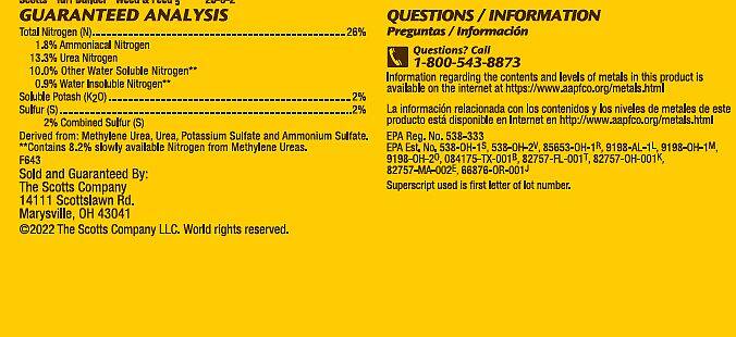 Guaranteed Analysis Total Nitrogen (N) 26%, 1.8% Ammoniacal Nitrogen, 13.3% Urea Nitrogen, 10.0% Other Water Soluble Nitrogen**, 0.9% Water Insoluble Nitrogen**; Soluble Potash (K2O) 2%; Sulfur (S) 2%, 2% Combined Sulfur (S). Derived from: Methylene Urea, Urea, Potassium Sulfate and Ammonium Sulfate. **Contains 8.2% slowly available Nitrogen from Methylene Ureas.