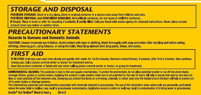Precautionary Statement Not for use on St. Augustinegrass (including Floratam), Dichondra, Lippia, Carpetgrass, or Bentgrass lawns. KEEP OUT OF REACH OF CHILDREN. Hazards to Humans and Domestic Animals. Environmental Hazards. See package label for extended warnings, directions, and storage & disposal information prior to use.