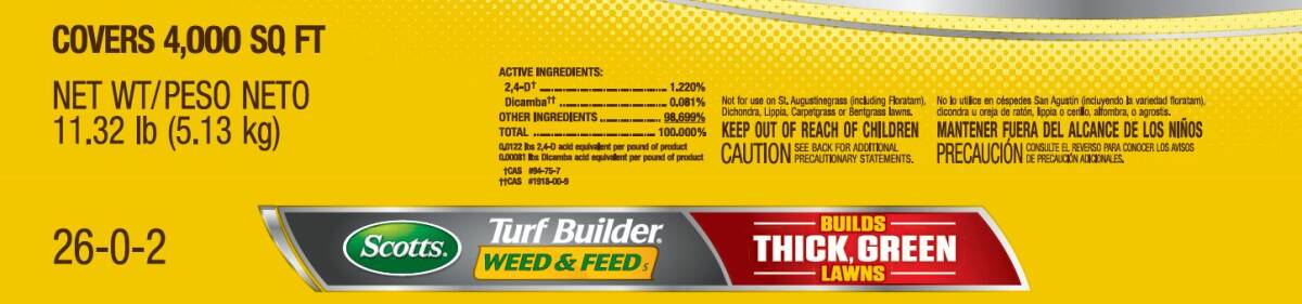 It's time to put a stop to weed-infested lawns - take action with Scotts® Turf Builder® Weed & Feed?. This weed killer and lawn fertilizer utilizes WeedGrip™ Technology to grip onto and kill the lawn weeds you see and the ones you don't. It controls over 50 listed weeds, including clover, dandelion, and plantain. In addition, this product feeds to thickens your lawn and crowd out any future weeds. Apply Scotts® Turf Builder® Weed & Feed? when weeds are actively growing and daytime temperatures are consistently between 60°F and 90°F. Make sure your grass is wet from dew or watering, as this helps particles adhere to weed leaves to produce the best results. We recommend using a Scotts® spreader to apply this product. For Scotts® broadcast/rotary spreaders, use a setting of 3 ¾. For Scotts® drop spreaders, use a setting of 7 ¼. Do not water your lawn for 24 hours after application or apply if rain is expected within the next 24 hours. Do NOT apply to Creeping Bentgrass, St. Augustinegrass (including Floratam), Dichondra, Carpetgrass, or Lippia.