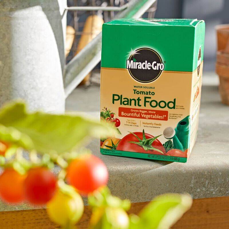 Picture a garden full of juicy tomatoes, crunchy carrots, and flavorful peppers. Miracle-Gro® Water Soluble Tomato Plant Food can help you grow that garden. This water soluble fertilizer grows bigger, more bountiful vegetables (compared to unfed plants). It feeds instantly, and is great to use on all types of vegetables, including tomatoes, cucumbers, squash, peppers, and carrots. Use watering can or Miracle-Gro Garden Feeder to apply. If using a watering can, mix 1-½ tablespoons (the large end of the enclosed scoop) per 1-½ gallons of water. For Miracle-Gro® Garden Feeder™, fill the jar to the top of the label. See feeder package for additional instructions. 3 lbs. of Miracle-Gro® Water Soluble Tomato Plant Food feeds approximately 1,200 sq. ft. of garden area. Once seedlings are well established, feed at normal recommended rates. For best results, use Miracle-Gro® Water Soluble Tomato Plant Food to feed your plants every 7 to 14 days.