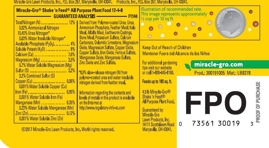 Miracle-Gro 4-1/2-Pound Shake 'N Feed All Purpose Plant Food (12-4-8) is a balanced dry fertilizer designed to feed and nourish plants both above and below the soil, ideal for use in garden beds and containers. Gardeners will appreciate its 12-4-8 NPK blend that delivers steady nitrogen, phosphate and potash to support leafy growth, blooms and root development, while a mix of polymer-coated urea and organic sources provides 8.6% slow-release nitrogen for longer feeding. The formula includes feather meal, kelp and earthworm castings along with bone meal and essential micronutrients like iron, manganese and zinc to help promote healthy, vigorous plants. Because it’s formulated to avoid burning when used as directed, it works for vegetables, flowers, shrubs and potted plants where even, reliable feeding and sustained nutrient release make routine care easier and more productive.