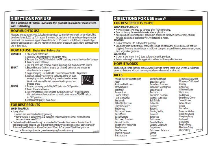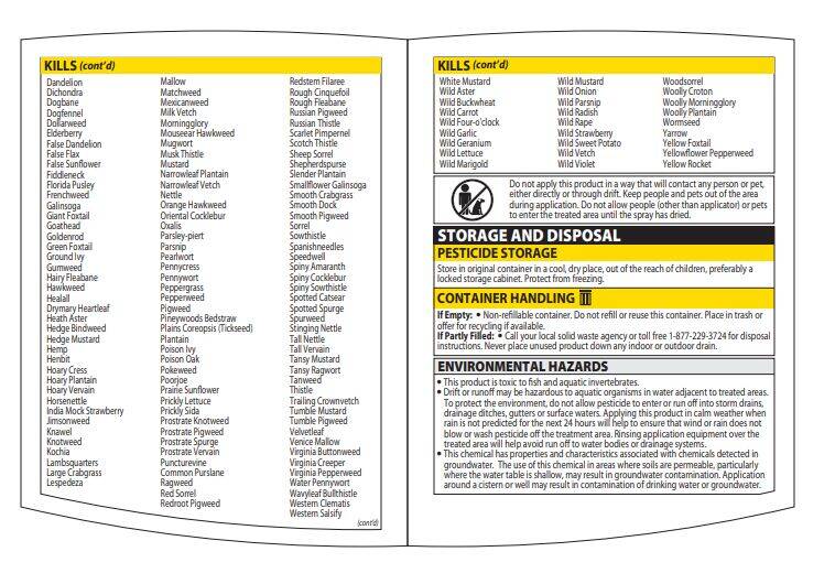 | Weeds Controlled | Black Medic, Broadleaf Plantain, Broadleaf Weeds, Virginia Buttonweed, Common Chickweed, Creeping Charlie, Dandelion, Dollarweed,Pennywort, English Daisy, Henbit, Lambsquarters, Large Crabgrass, Common Lespedeza, Oxalis, Red Clover, Smooth Crabgrass, Spotted Spurge, Thistle, Wild Mustard (See label for complete list) |