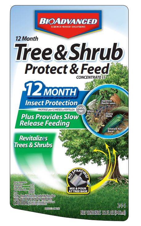 32 oz, BioAdvanced Tree and Shrub Protect and Feed Liquid Concentrate Insect Killer provides 12 month protection, plus provides slow release feeding to revitalize trees and shrubs.