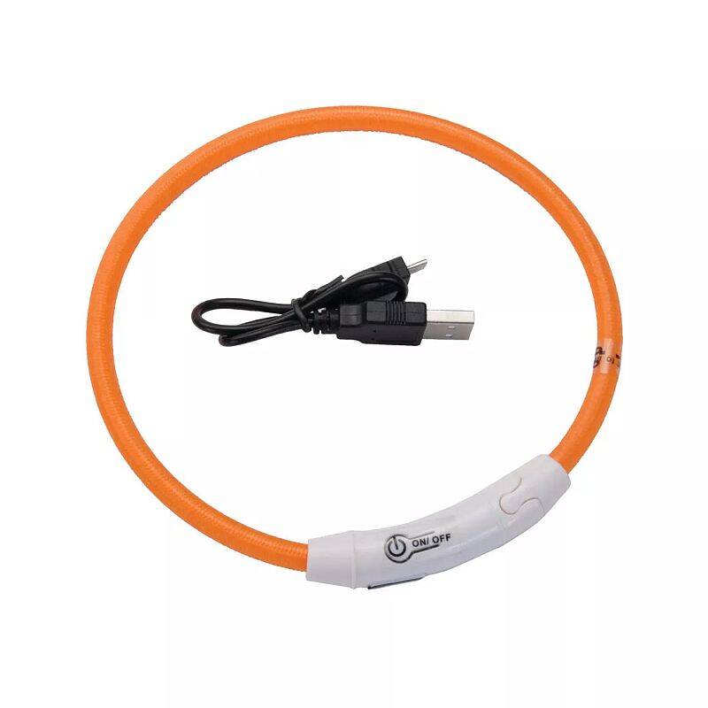 Improve safety and visibility on your next nighttime walk with the USB Light-Up Neck Ring! This neck ring provides 360-degree illumination for maximum visibility in rain or shine with its bright, waterproof design. Putting the ring on is simple: Just snap the ends together to wear alongside your dog's favorite collar. You can customize the fit by easily cutting the material to your dog's size. Effortlessly switch between three eye-catching light settings with the ring's simple power button. Use the ring up to five hours with the flashing setting or 3 hours on the continuous light setting before recharging with the USB charger included with your order. Charging takes approximately 40 minutes. Don't take your dog on a nighttime stroll without this safety light!