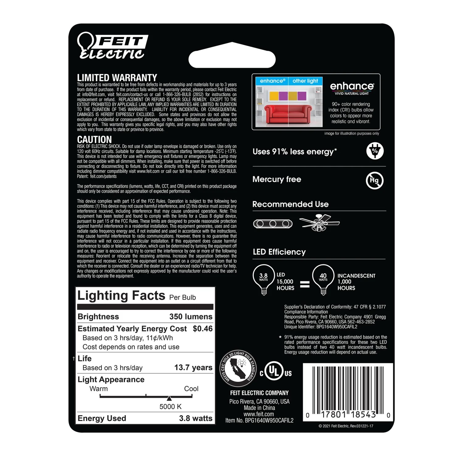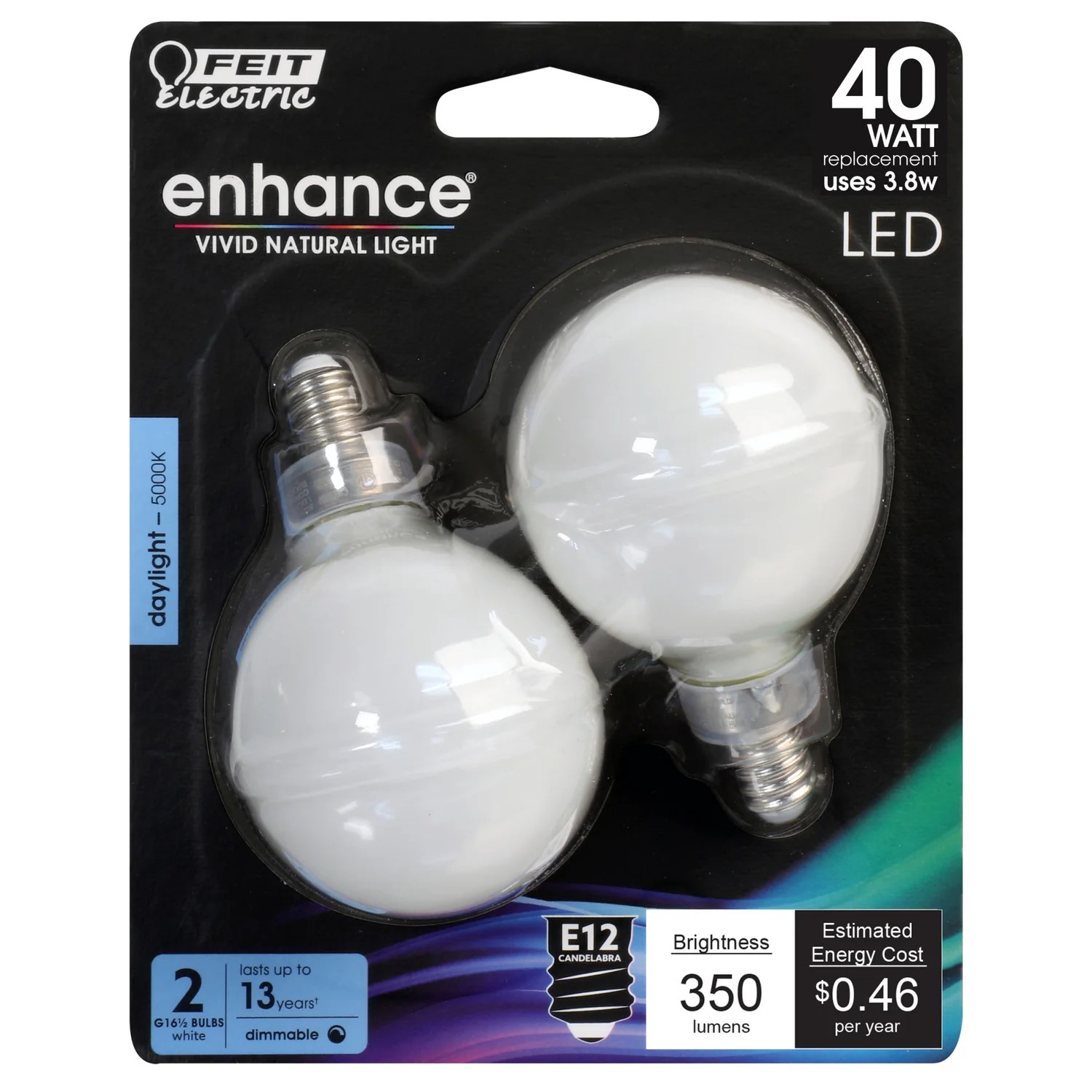 Combine the vintage glass filament lighting look and feel with the advantages of modern LED technology with these stylish light bulbs from Feit Electric. Energy-efficient LEDs replace a 40-watt incandescent, producing a 5000K Daylight color temperature light that energizes mornings and illuminates fine details. A frosted G16 1/2 mini-globe design with exposed filament wrapped in frosted glass housing is ideal for chandelier fixtures and will enhance the décor of any room. Enhance 90+ CRI light makes colors vibrant and skin tones more natural, all while saving energy and lasting for decades.
