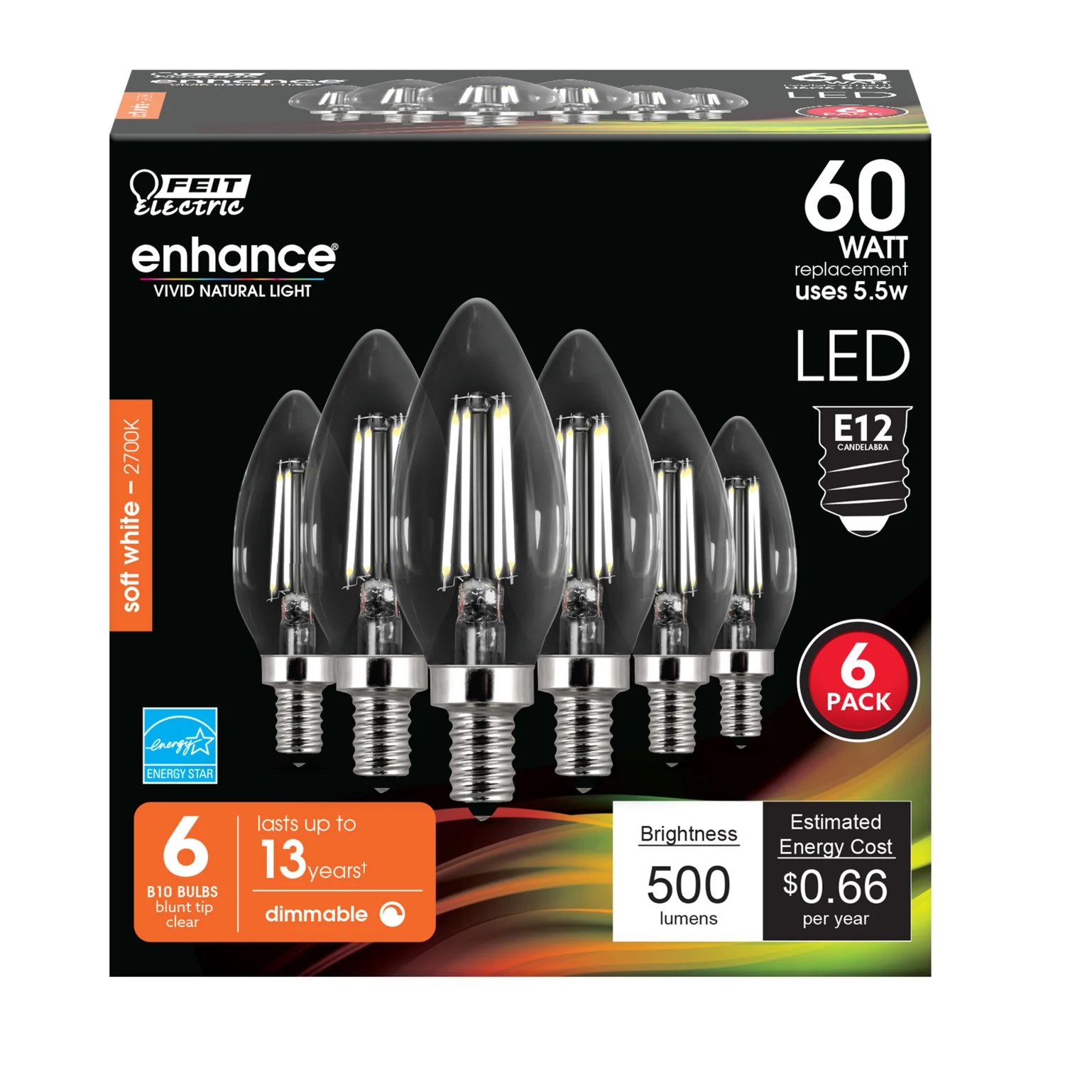 Enjoy all the benefits of advanced LED energy-saving technology with a high-CRI chandelier LED light bulb from Feit Electric. Replacing a 60-watt incandescent light, this B10 blunt-tip bulb produces 500 lumens of 2700K Soft White light while using only 5.5 watts of electricity - saving up to 90% in energy costs. A stylish tapered design with exposed filament instantly livens up the décor of any room and a 90+ CRI makes colors vibrant and skin tones look more natural, all while saving energy and lasting for a decade or more.