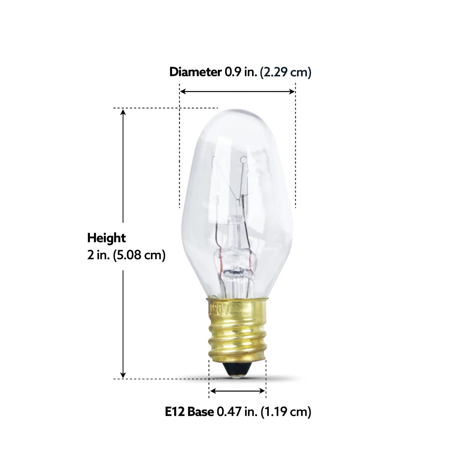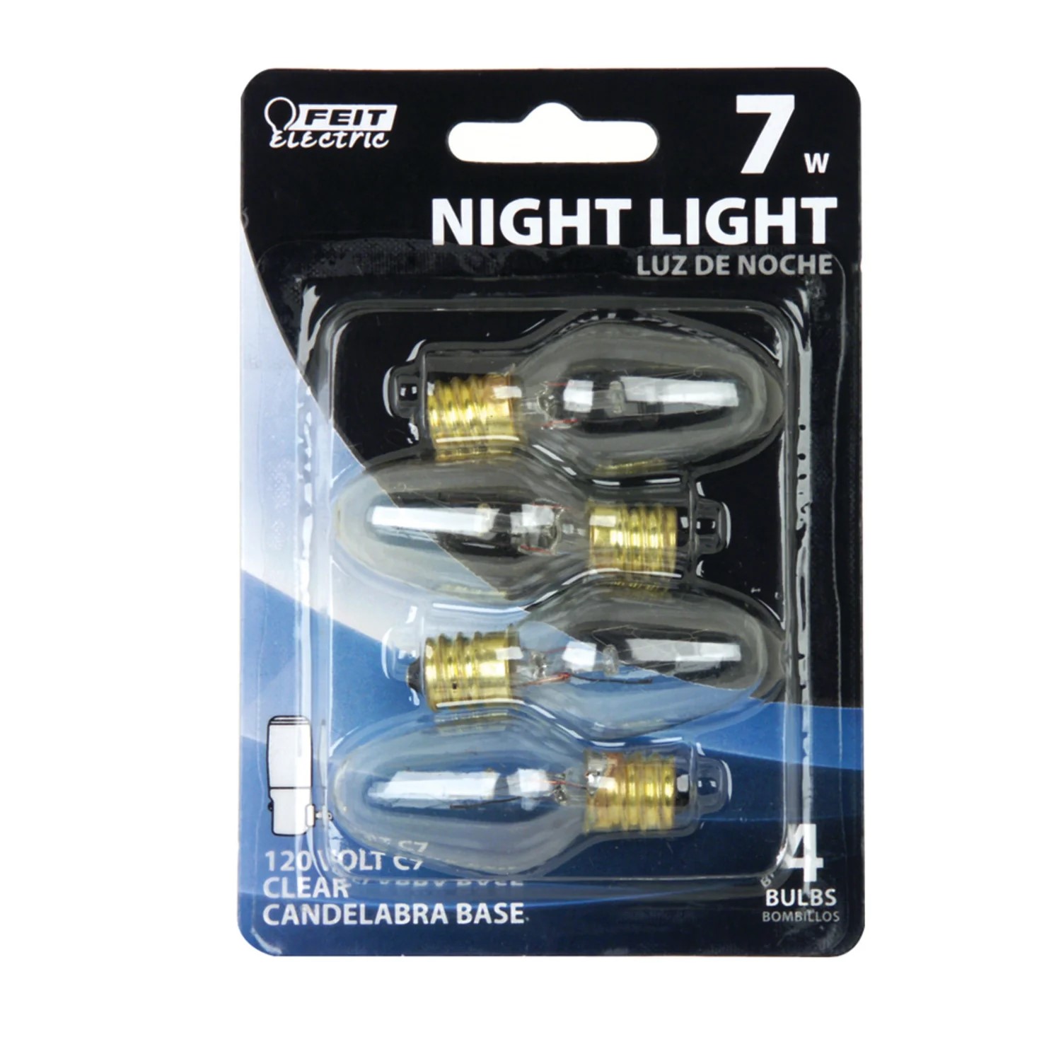 Feit Electric 7-Watt Soft White Clear C7 light bulbs are made specifically for night lights. Their Soft White glow provides warm, relaxing light. Replace burned-out bulbs in plug-in night lights for kids’ rooms, bedrooms, bathrooms, and hallways. They produce a low-light glow that is easy on the eyes at night and won’t disrupt sleep. They are fully dimmable and rated to last up to 3,000 hours. Choose a dependable night light bulb for residential or commercial applications.