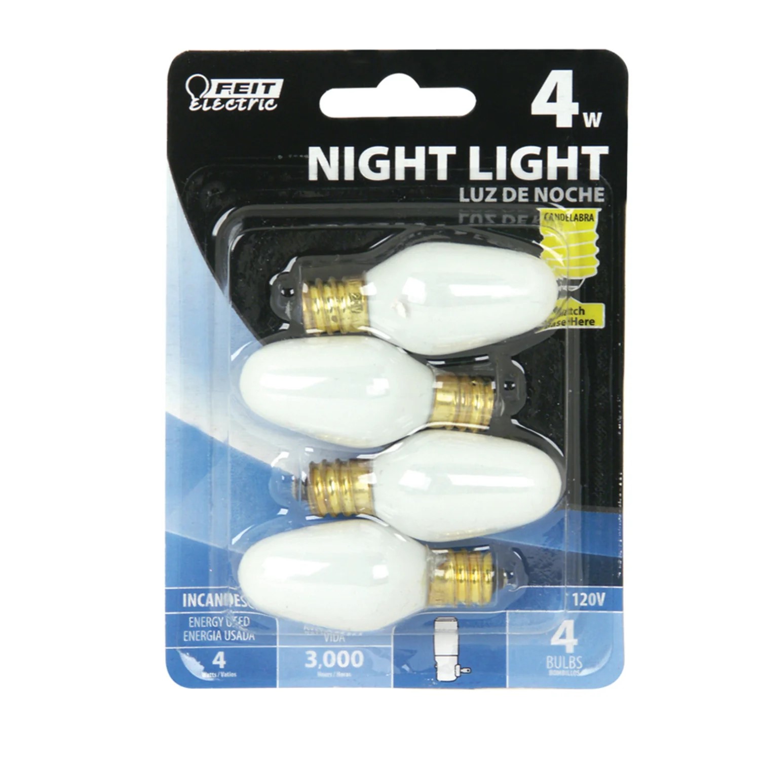Keep indoor spaces lit at night with Feit Electric 4-watt C7 White Night Light bulbs. Our BP4C7/W/4/RP bulbs replace traditional incandescent night light bulbs. They produce a 2700K Soft White glow while using only 4 watts of electricity. The bulbs are fully dimmable, with a Candelabra base that fits in E12-base night lights, indicators, toys, and appliances. Use them in bedrooms, hallways, and bathrooms for a low-light glow that won’t keep you up at night. They have an average life of 3,000 hours and an estimated annual energy cost of only $0.48. Choose a dependable Feit Electric light for your space.