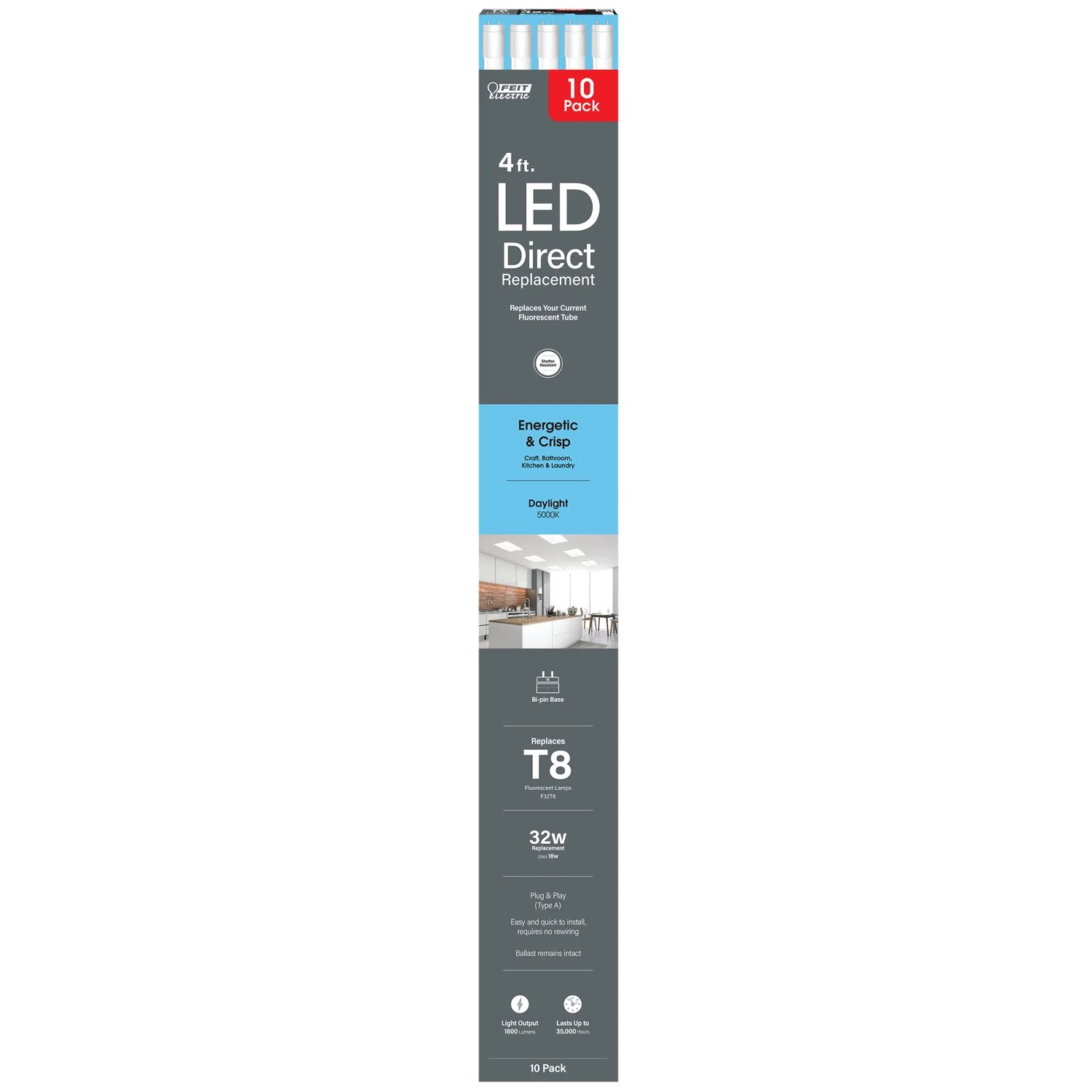 18-watt (32-watt Equivalent) Direct Replacement (Type A) Non-Dimmable Linear LED Tubes replace F32T8 or T8 fluorescent and LED tubes. They work with most existing electronic ballasts for quick and easy plug-and-play installation, with no rewiring necessary. Each Linear LED light produces 1800 lumens, emitting the same light output level as traditional fluorescent linear lights while using 43.8% less energy. These bright 5000K Daylight White lights provide crisp light for both residential and commercial spaces. They emit an invigorating cool white light ideal for reading, working on intricate projects, and revealing fine details. Create an energetic mood ideal for craft rooms, bathrooms, kitchens, laundry rooms, utility rooms, outdoor security lighting, classrooms, and hospitality settings. T848/850/LED/10 lights turn on instantly, offering flicker-free full illumination with no warmup time compared to fluorescent tubes. They are mercury-free, with a shatter-resistant coating for safe and easy disposal. Each high-quality bulb offers accurate color-rendering, for more vibrant, true-to-life colors. Lower heat emission extends the life of the tube and ends do not turn black or burn with age. The estimated energy cost is only $2.17 per year. Switch to Type A LED linear lights for your space and get up to 35,000 hours of superior light. That's 31.9 years based on 3 hours of daily use.