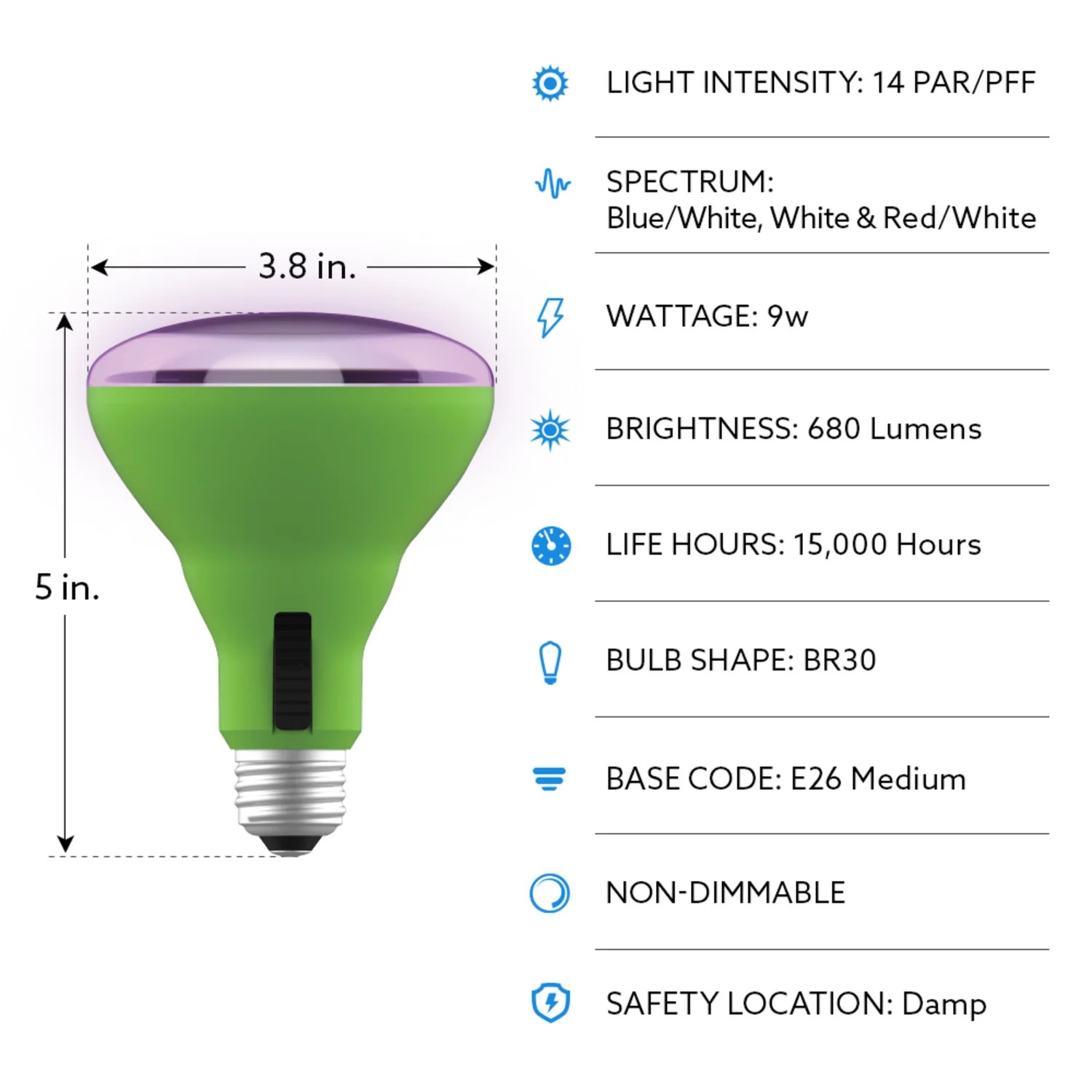 9-Watt Br30 Selectable Spectrum For Seeding/Growing/Blooming Indoor Greenhouse Plant Grow E26 LED Light Bulb