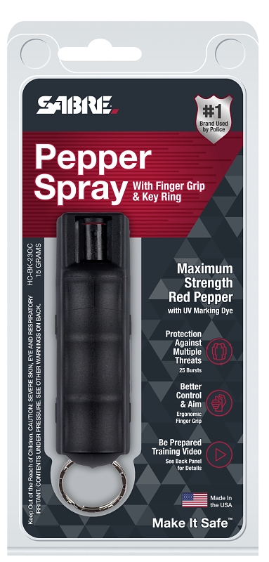 Sabre Pepper Spray with finger grip and key ring is maximum strength with UV marking dye provides protection against multiple threats. The ergonomic finger grip creates better control and aim.