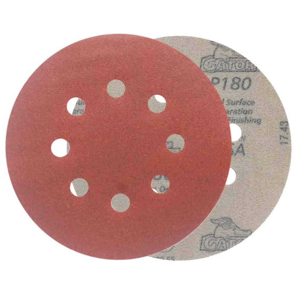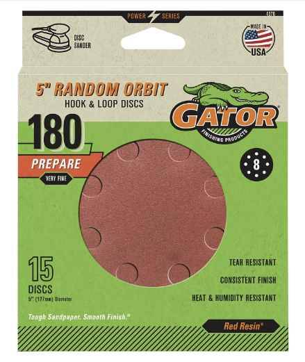 Gator® 5 inch random orbit sanding discs provide superior finishing results and good value. These Red Resin discs are specifically designed for power tool use as they resist heat build-up and humidity for longer life. The quick change hook and loop holding system allows for easier and faster disc changing. The 8 hole vented pattern takes full advantage of the sander's dust collection systems keeping your work area cleaner.