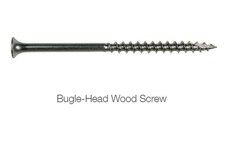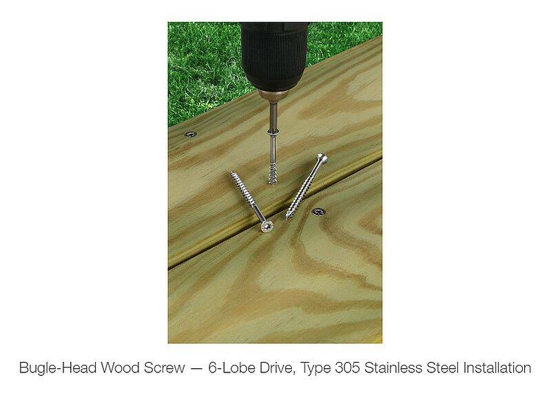 The stainless-steel Bugle-Head Wood screw provides superior corrosion resistance while fastening all types of wood decking, including cedar, redwood and preservative-treated woods (non-hardwood). The 6-lobe drive recess provides for a secure bit which reduces cam-outs and leads to longer bit life. The bugle-head feature engineered for flush countersinking yields beautiful fastening results for a more concealed, professional finish.
