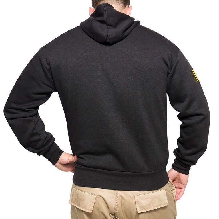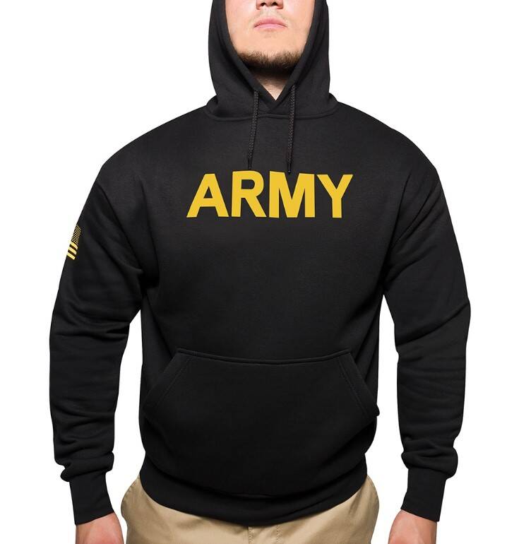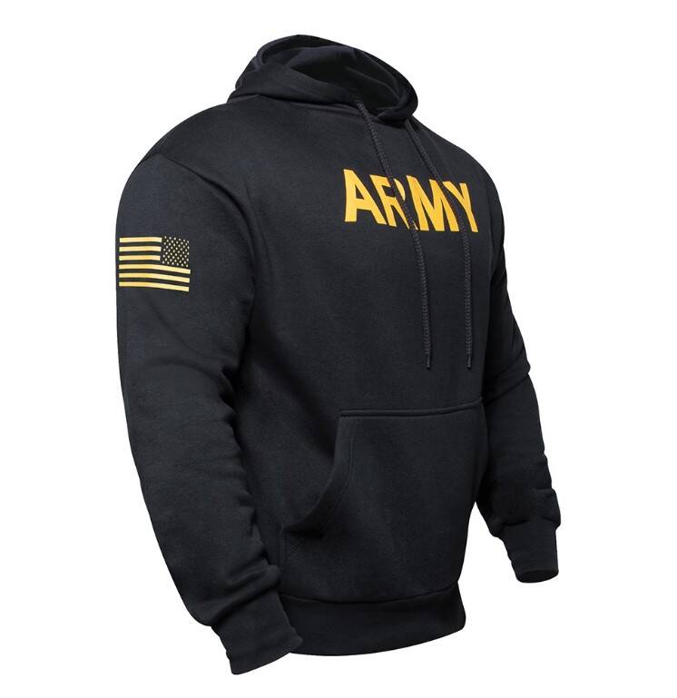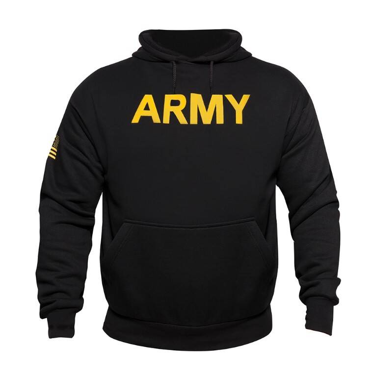 Rothco Black Army hooded pullover sweatshirt is perfect for outdoor activites and cold weather training. A lightweight and soft sweater is made for workouts or everyday wear. The drawstring and elastic wrist cuffs help keep the chill out.