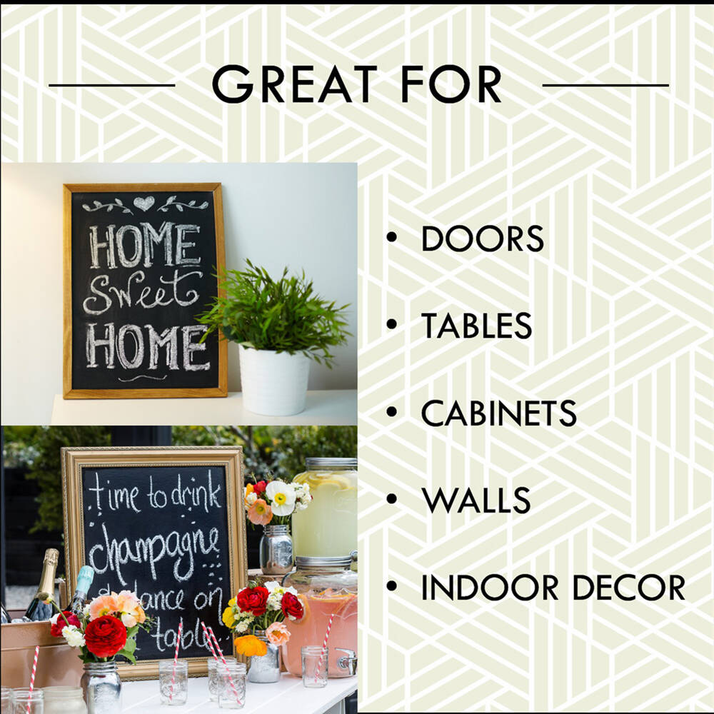 Rust-Oleum Chalkboard Paint converts interior surfaces to an ultra hard, usable chalkboard. Unique coating allows for complete customization of indoor surfaces to create fun play rooms or functional creative spaces.