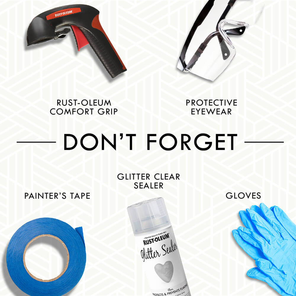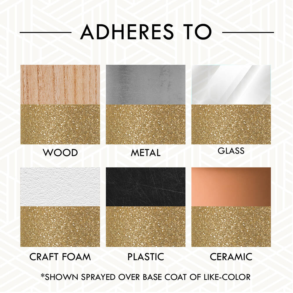 Rust-Oleum Specialty Glitter Spray and Sealer adds the brilliant shine of glitter to any indoor craft or décor project. Glitter can be built over multiple coats to create a custom look and sealed with the specialized top coat so that it will not rub off onto other items. For best results, prepaint surfaces with a complementary base color.