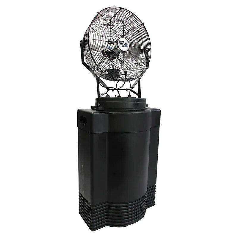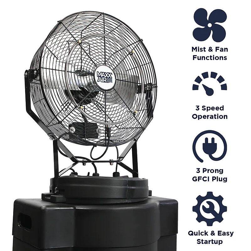 Use this portable Maxx Air misting fan for anything, from a fire ground cooling fan or athlete sideline fan, for barn and equestrian use, entertainment venues, and even at home on the patio!<p>Built with heavy-duty steel components and a rotomolded polyethylene tank, this mid-pressure misting system is engineered to stand up to moisture and hard use indoors or out. This patio cooler arrives to you fully assembled and can be stored or made more compact for truck or SUV transport by placing the fan head in the cooler tank when not in use. Enjoy an all-day mist with 13 to 14 hours of run time on a single fill of our 40-gallon tank, or use it in fan-only mode for instances where mist isn't desirable.