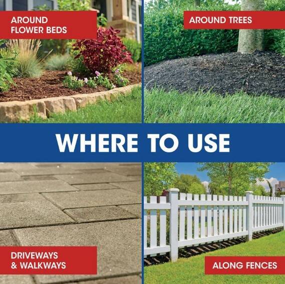 • Use in or around flower beds and perennial landscape plants, around trees and shrubs, on patios, walkways, and driveways, gravel, or mulch beds, along fences and foundations, and edging around foundations and retaining walls