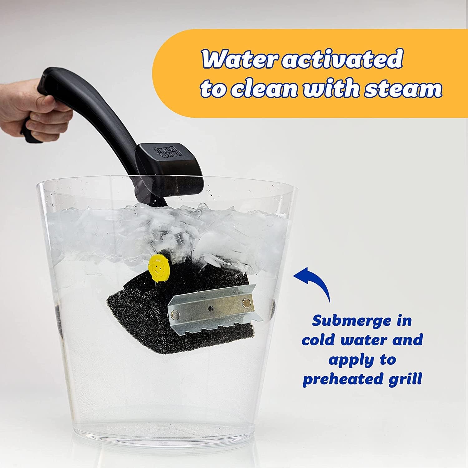BBQ Daddy’s high-tech scrubbing head has a unique FlexTexture core that firms up when dipped into cold water. As you scrub, steam from the grill boosts your cleaning power and the head gradually softens to reach deep into the grates.