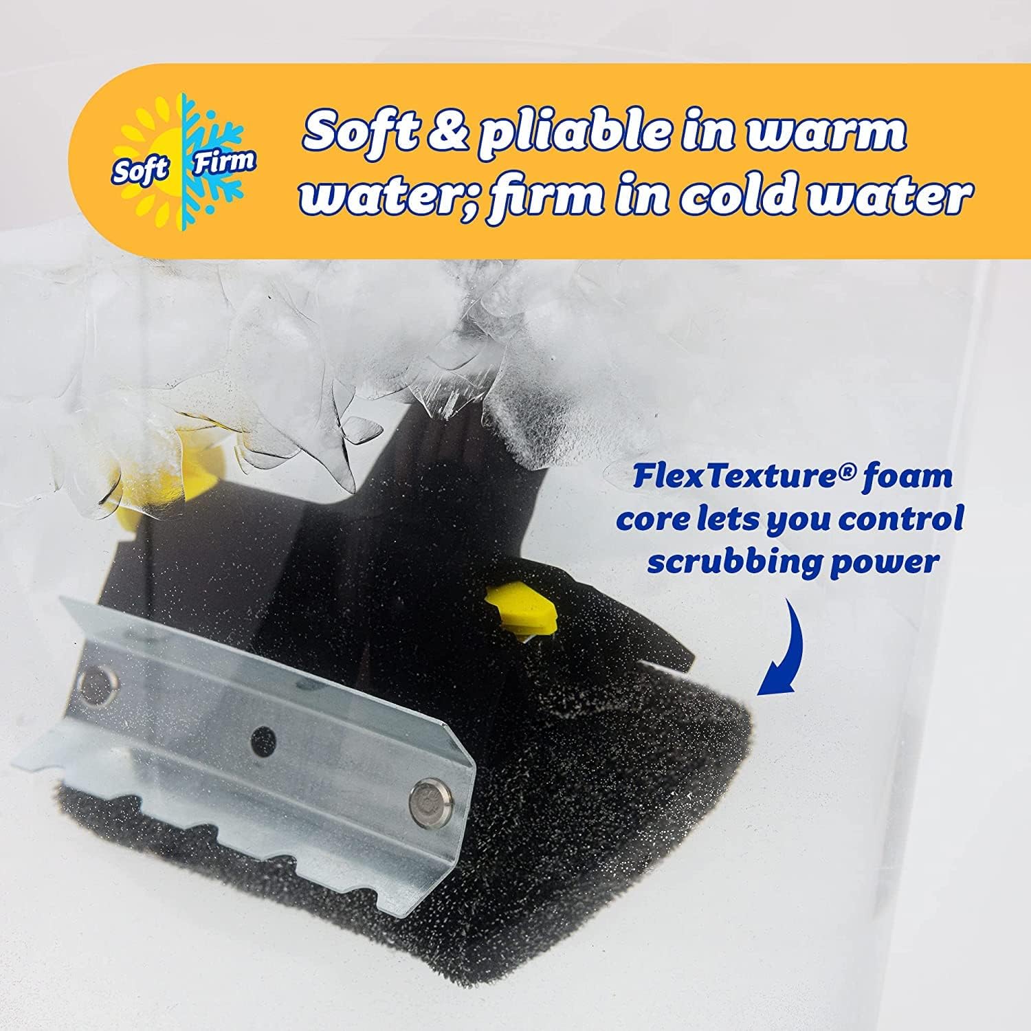 - Flextexture foam core allows you to control your scrubbing power. Soft in warm water and firm in cold.