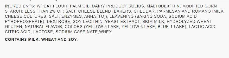Ingredients Wheat Flour, Vegetable Oil (Palm Kernel Oil, Palm Oil And/or Hydrogenated Palm Oil), Whey, Maltodextrin, Food Starch-Modified, Salt, Less Than 1.5% Cheese Blend (Bakers And Cheddar, Parmesan, Romano Milk, Cultures, Salt, Enzymes, Annatto Color), Corn Flour, Leavening Baking Soda, Sodium Acid Pyrophosphate), Dextrose, Skim Milk, Hydrolyzed Wheat Gluten, Coloring (Yellow 5 Lake, Yellow 6 Lake, Blue 1 Lake), Lactic Acid, Citric Acid, Lactose, Sodium Caseinate