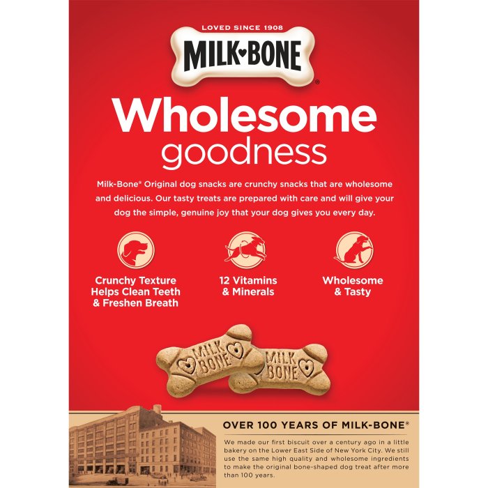Make your dog′s life more fun with delicious dog snacks from a brand you can trust. Milk-Bone Original dog biscuits are prepared with care and will give your dog the simple, genuine joy that your dog gives you every day. How? A classic crunch with a wag-worthy taste. Better yet, the crunchy texture of Milk-Bone dog biscuits helps freshen dogs′ breath and reduce tartar build-up, so you can fully enjoy all those sloppy doggie kisses. These tasty dog treats even contain vitamins and minerals — 12, to be exact. So you′ll be almost as happy to give them as your dog is to get them … almost.