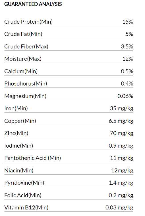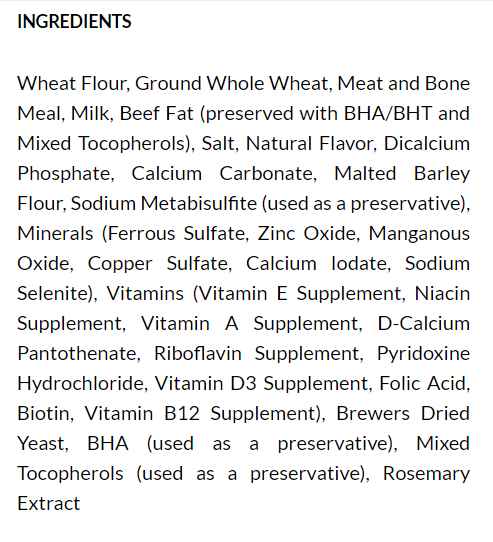 | Ingredients | Wheat Flour, Ground Whole Wheat, Meat and Bone Meal, Milk, Beef Fat (preserved with BHA/BHT and Mixed Tocopherols), Salt, Natural Flavor, Dicalcium Phosphate, Calcium Carbonate, Malted Barley Flour, Sodium Metabisulfite (used as a preservative), Minerals (Ferrous Sulfate, Zinc Oxide, Manganous Oxide, Copper Sulfate, Calcium Iodate, Sodium Selenite), Vitamins (Vitamin E Supplement, Niacin Supplement, Vitamin A Supplement, D-Calcium Pantothenate, Riboflavin Supplement, Pyridoxine Hydrochloride, Vitamin D3 Supplement, Folic Acid, Biotin, Vitamin B12 Supplement), Brewers Dried Yeast, BHA (used as a preservative), Mixed Tocopherols (used as a preservative), Rosemary Extract |